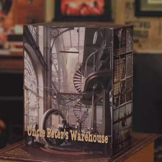 Step into a world of gears and tools with this "Uncle Peter's Warehouse" Bookshelf Diorama. This DIY Book Nook Kit allows you to build a fascinating reading corner with an industrial and vintage design. The scene captures the essence of an old warehouse, with handmade details like tools and machinery that transport you to a steampunk universe.